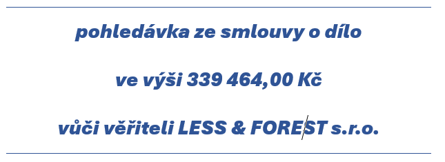 - Pohledávky ze smlouvy o dílo ve výši 339 464,00 Kč vůči spol. LESS & FOREST s.r.o., jenž se nachází v konkursu pod sp.zn. KSPH 66 INS 23802 / 2012